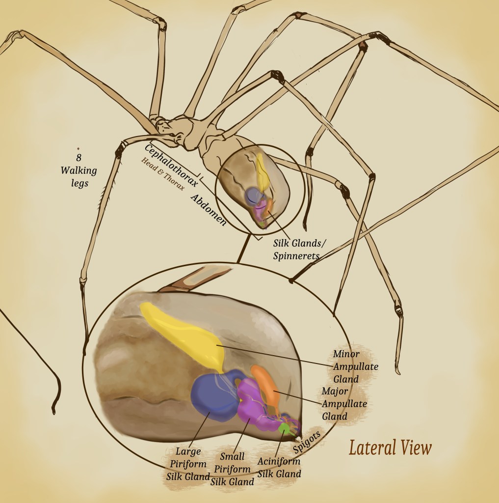 There are seven types of silk gland; cylindrical glands, aggregate glands, flagelliform glands, major ampullate glands, minor ampullate glands, aciniform glands and piriform glands, if you’re interested.