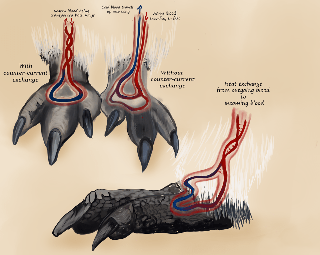 There’s a certain saying from a book of Wintersmiths, “If you want something done, give it to someone who’s busy.” A penguin’s body is a busy place. Efficiency and laziness is key. Cold blood from the feet can ruin the delicate equilibrium of homeostasis. Penguins entwine the accusatory veins with warmer veins from the heart, enabling the transfer heat, that will be lost anyway, to the cold veins. Counter-current heat exchange ensues the feet are fed just enough warm blood to stay above freezing. Thermal convection will deal with the rest. Keeping the outer layer of feathers cold, while the skin and downy layer are warmed by the body creates small waves of convection currents between the cold outer layer, enabling penguins to absorb back some of the cycling heat that’s being lost through the feathers before it cycles away again. Like waves depositing pebbles on a beach. I’ve come over all poetic, so to counter this.