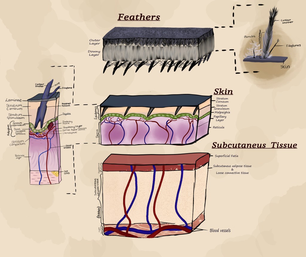 Penguins are apparently not as dense as we thought. They focus their feathers around their core, 29% to 50% more around their chest than their dorsal. But it’s the spatial organisation that matters, not feather count. Each contour and attached filoplumes have approximately 9 surrounded by plumules. Hence why the dapper dipper (Cinclus) has a higher density of contour feathers but will never be a king or an emperor when it comes to plumules.