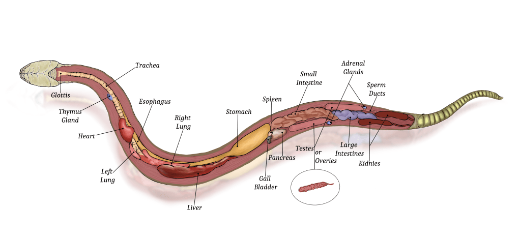 We start in an unlikely place. The skin. Snake skin needs to be stretchy, in the case of Anaconda the scales overlap to a certain degree, allowing for the skin and connective scales to expand for their meal. As for your organs; everything is long and everything in pairs is staggered to fit into a long thin tube, allowing organs to shift when the stomach and gut expand without crushing any other organs. Your lungs are also de-vascularised at the back for the same reason. The long structure means that air travels through parts of the lungs, allowing you to breathe while your organs are being crushed at the front and then the back, as large prey items are swallowed. You’ll have a large gall bladder to deal with fatty food, like the well-fed mammals on your menu, and of course, very strong stomach acid that dissolves hair, teeth, tissue, even the largest, densest bones.